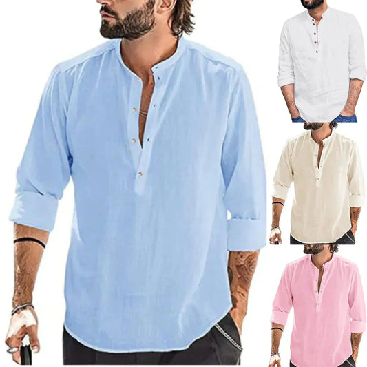 Camisa informal de manga larga de algodón y lino para hombre 2025-ES