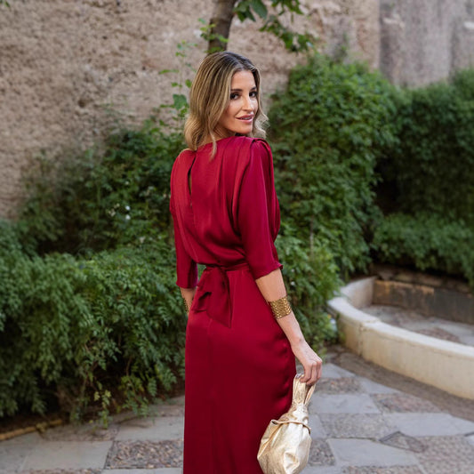 Jednobojna satenska midi haljina s okruglim izrezom i kratkim rukavima-HR