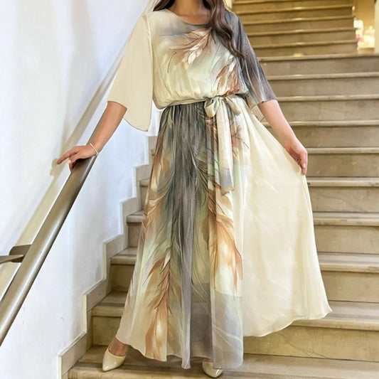 Maxi obleka z okroglim izrezom in potiskom ter pasom-SI