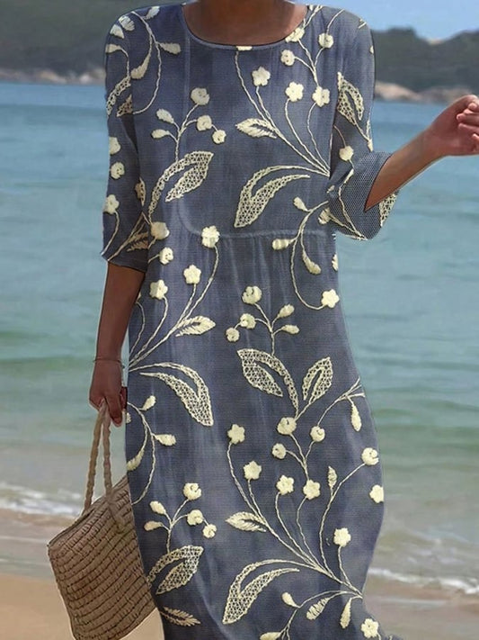 Moteriška vienspalvė apvali kaklo pusė gėlėto medvilnės ir lino suknelė-LT