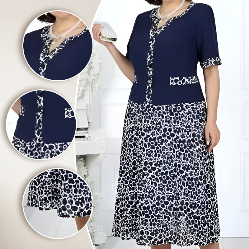 DETALLES ELEGANTES Y CONTRASTANTES: El vestido presenta un corpiño azul marino intenso decorado con acentos florales en las mangas, los bolsillos y el escote, que complementan maravillosamente la falda estampada, agregando un carácter elegante al conjunto.