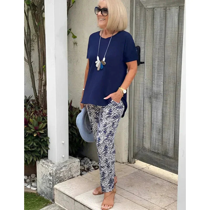 VERSÁTIL Y ELEGANTE: Este conjunto de dos piezas no solo es práctico, sino también elegante. Una blusa sencilla combinada con unos pantalones con estampados elaborados crea un look chic y moderno, perfecto para conjuntos elegantes e informales.