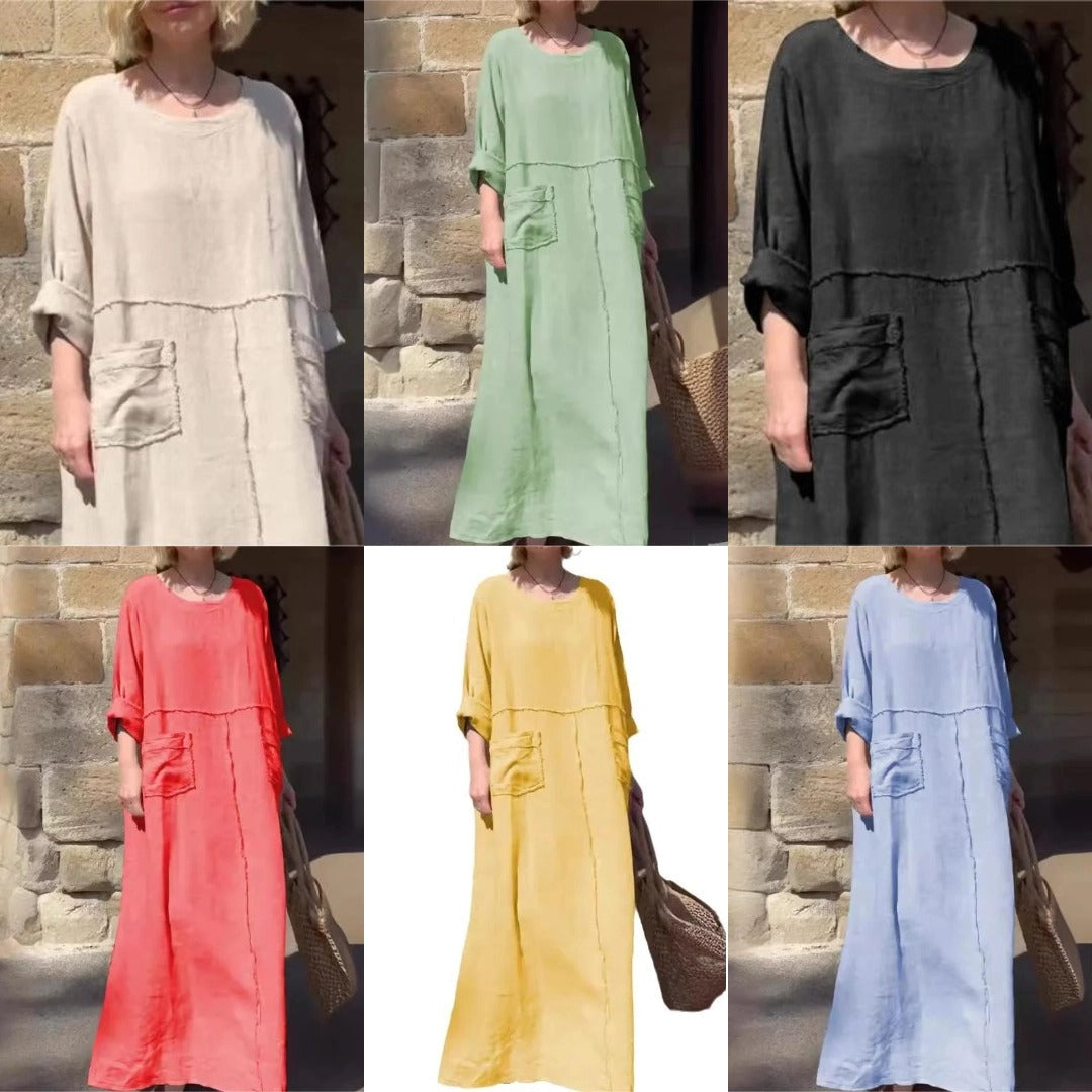 🌿Μονόχρωμο φόρεμα με στρογγυλή λαιμόκοψη, αναπνεύσιμο🌪️-GR