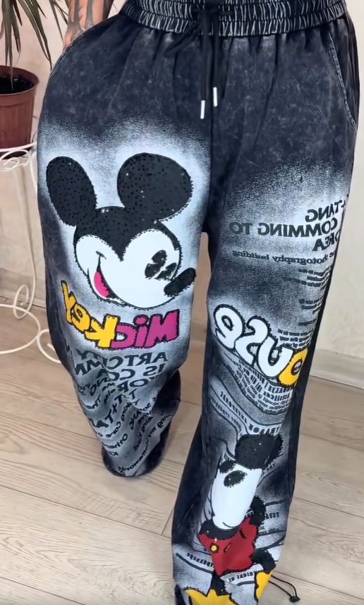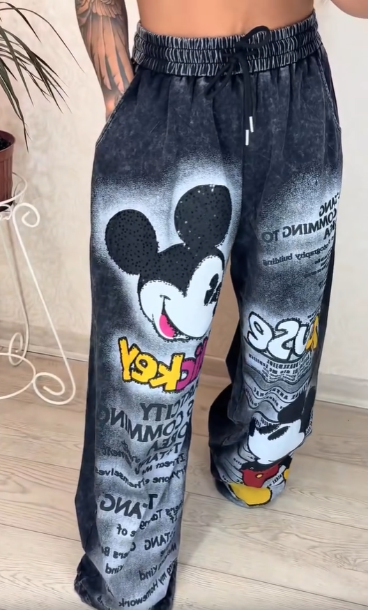 Medžiaga: audinio sendinta tekstūra suteikia animaciniam raštui trimatesnį vaizdą, natūraliai krenta einant ir leidžia nevaržomai judėti. Jis suteikia komforto ilgų apsipirkimo kelionių ir treniruočių metu, kartu derindamas vaikišką paprastumą su praktiškumu.