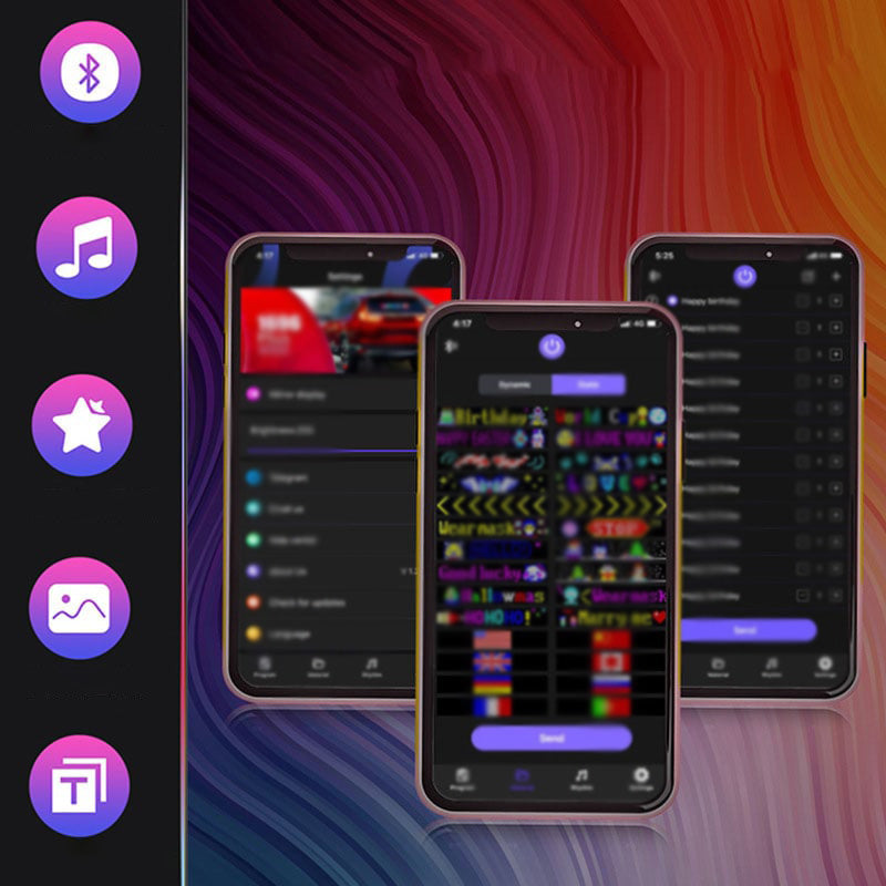 Spremenite svoj avto v edinstveno in privlačno atrakcijo z barvitim zaslonom z očesnimi lučkami ! Ta inovativen izdelek vam omogoča prikaz vzorcev oči v živo ali prilagojenih animacij neposredno na oknih vašega avtomobila, kar doda dinamičen pridih vsakemu vozilu. Z uporabo priročne mobilne aplikacije lahko preprosto prilagodite zaslon z vzorci, animacijami in besedilom, da bo vaš avto izstopal na cesti.