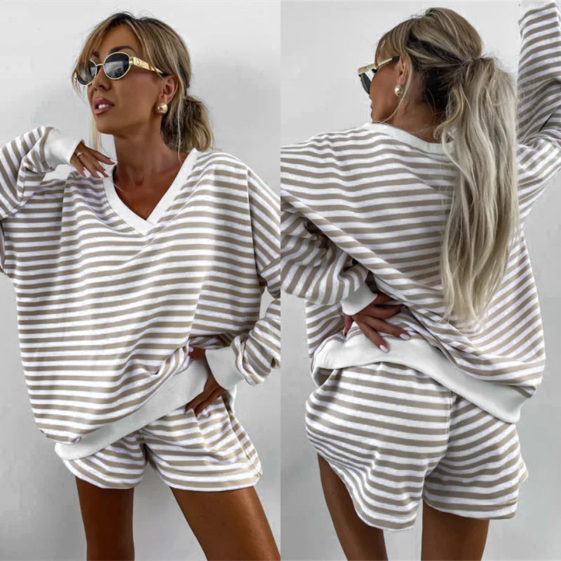 Dviejų dalių moteriška apranga Dryžuota V formos iškirpte Laisvi viršutinė dalis ir šortai