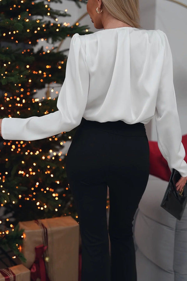 Αυτό το σατέν μπλουζάκι με λαιμόκοψη σε V είναι σίγουρα μια επιτυχία στη μόδα! Το εκλεπτυσμένο, γυαλισμένο ύφασμα και οι κομμένες μανσέτες βοηθούν το πουκάμισο να κολλάει στο σώμα και δημιουργούν ένα πτυχωτό αποτέλεσμα που τονίζει όμορφα τη μέση. Το ντεκολτέ, στο οποίο είναι κεντημένο ένα κομψό τριαντάφυλλο, τραβάει την προσοχή. Συνδυασμένα τέλεια με κομψά παντελόνια και φούστες, τα πουκάμισα προσθέτουν μια πινελιά λάμψης στο ντύσιμό σας, είτε πρόκειται να βγείτε για μια βραδινή έξοδο είτε να γιορτάσετε ένα σημαντικό γεγονός.